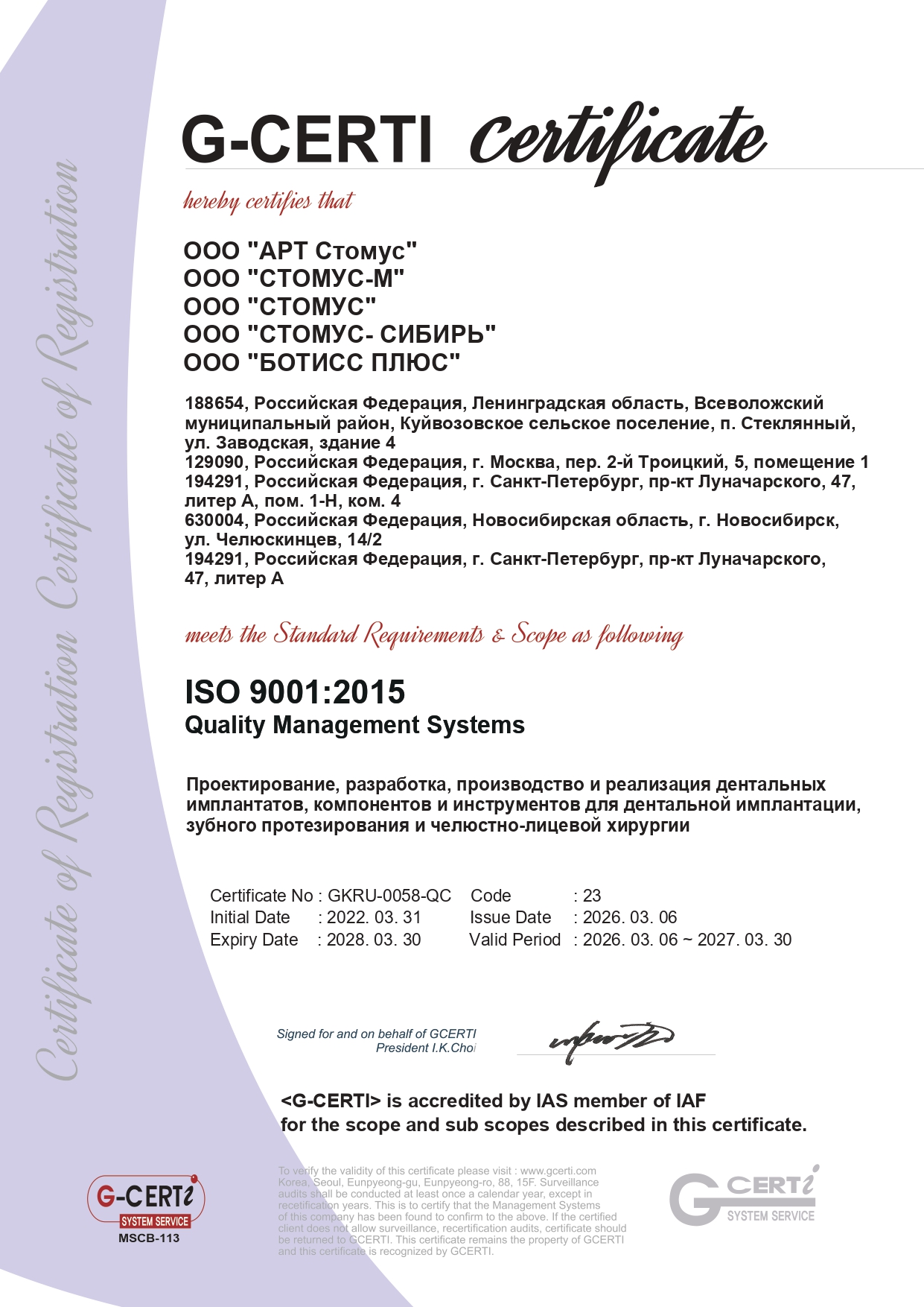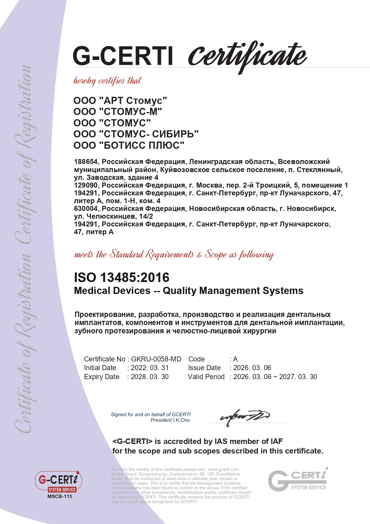 Интегрированная система менеджмента качества НПК ART сертифицирована на соответствие требованиям международных стандартов ISO 9001:2015 и ISO 13485:2016 (ISO — ИСО — Международная организация по стандартизации) органом по сертификации G-CERTI Co., Ltd. Данная система менеджмента качества обеспечивает устойчивое соответствие продукции требованиям заказчиков, многоступенчатую систему контроля качества, а также постоянное совершенствование выпускаемых изделий
