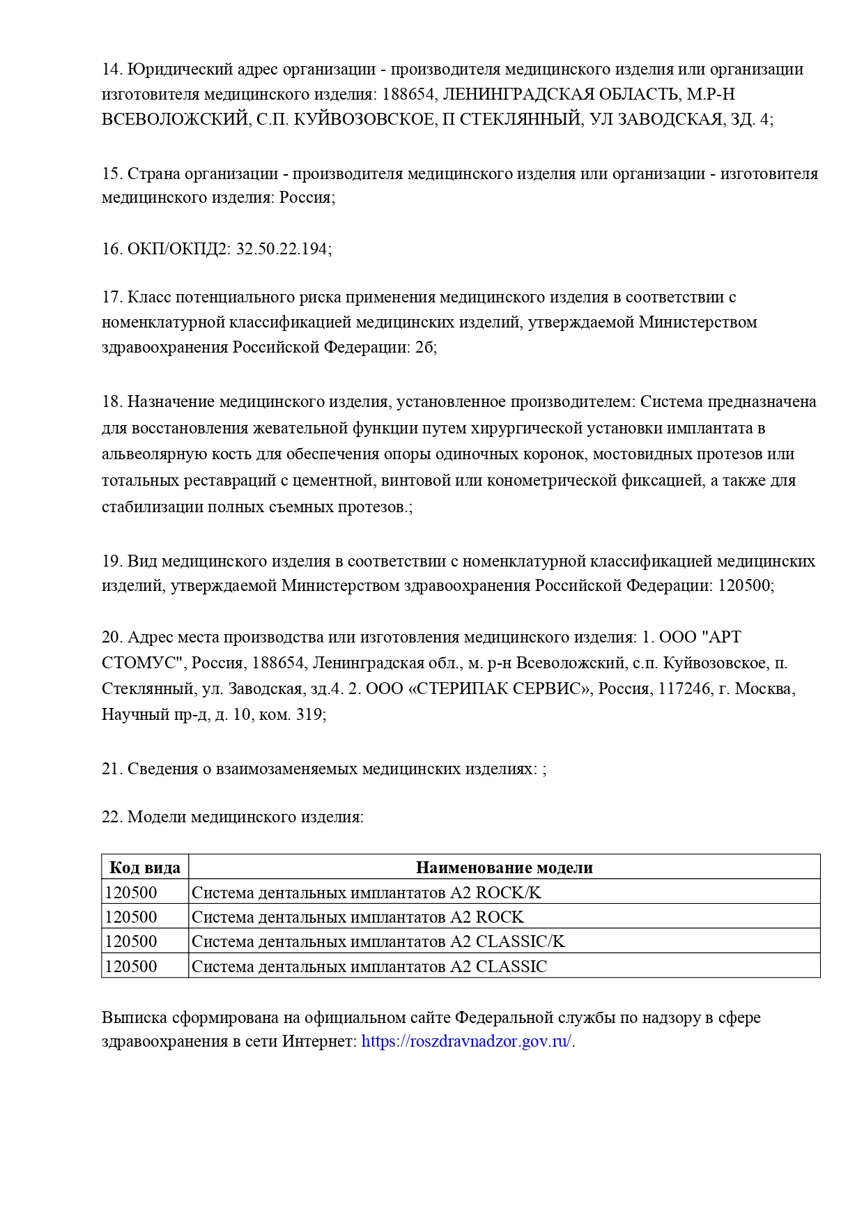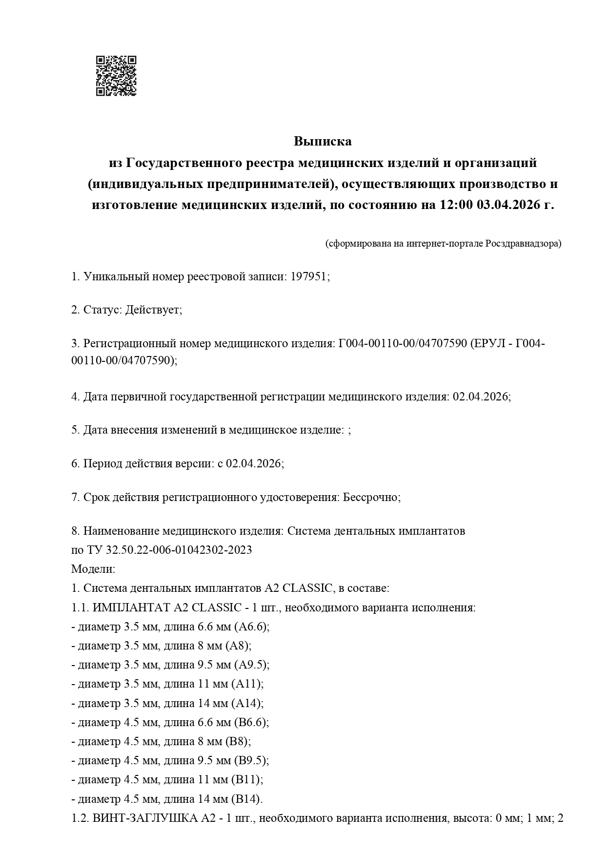 - Регистрационный номер медицинского изделия Росздравнадзора № Г004-00110-00/04707590 от 02.04.2026